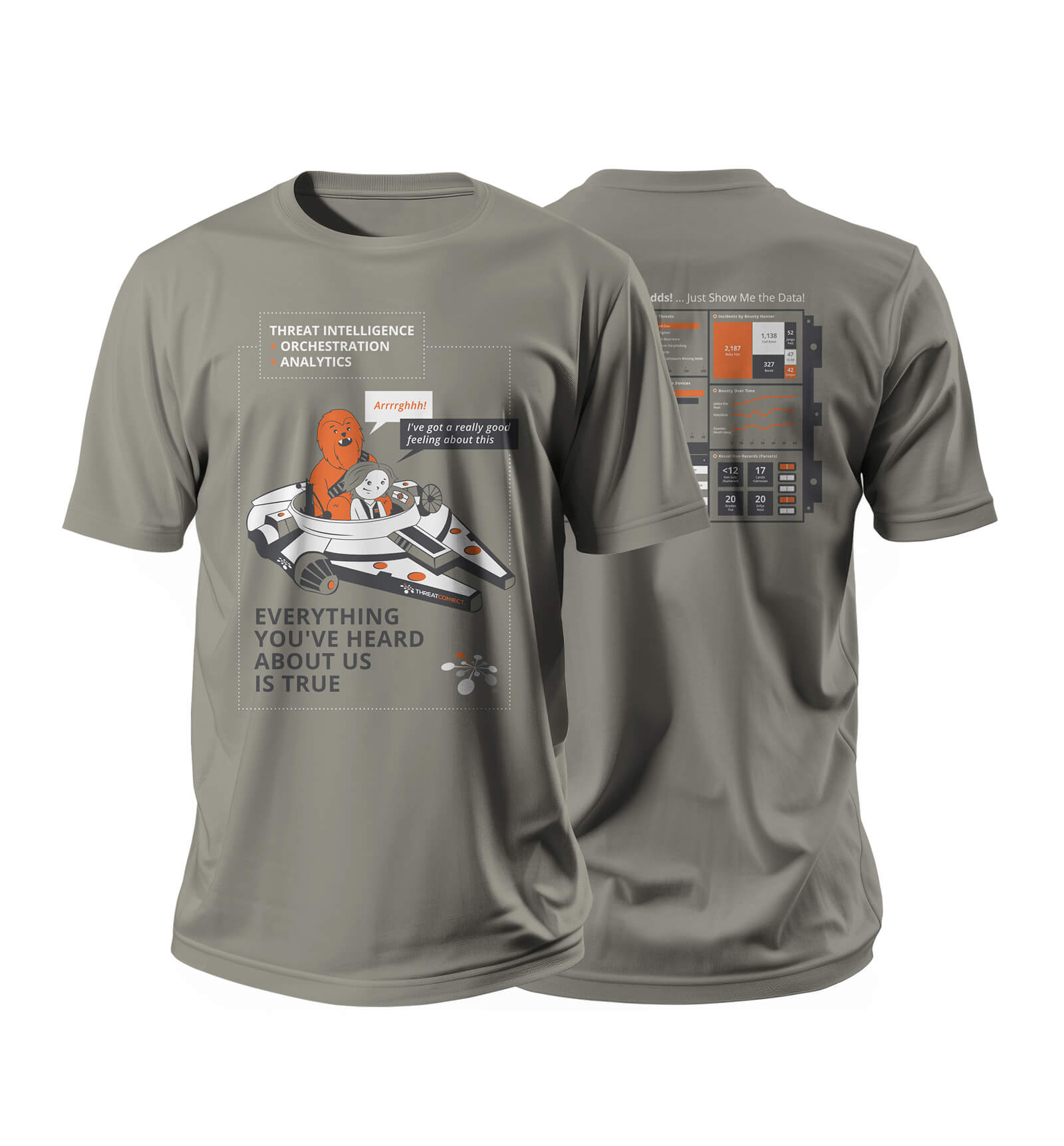 A wink to Star Wars fans and a badge of honor for threat intel teams, this 2018 ThreatConnect Black Hat T-shirt celebrates instinct, experience, and knowing when the data backs you up. Inspired by everyone’s favorite Wookiee copilot, it pairs humor with confidence, calling out the balance between gut feel and analytics that defines great intelligence work. With front-and-back graphics that reward a closer look, this limited-edition tee is for those who trust the process, trust the platform, and aren’t afraid to say, “I’ve got a really good feeling about this.”